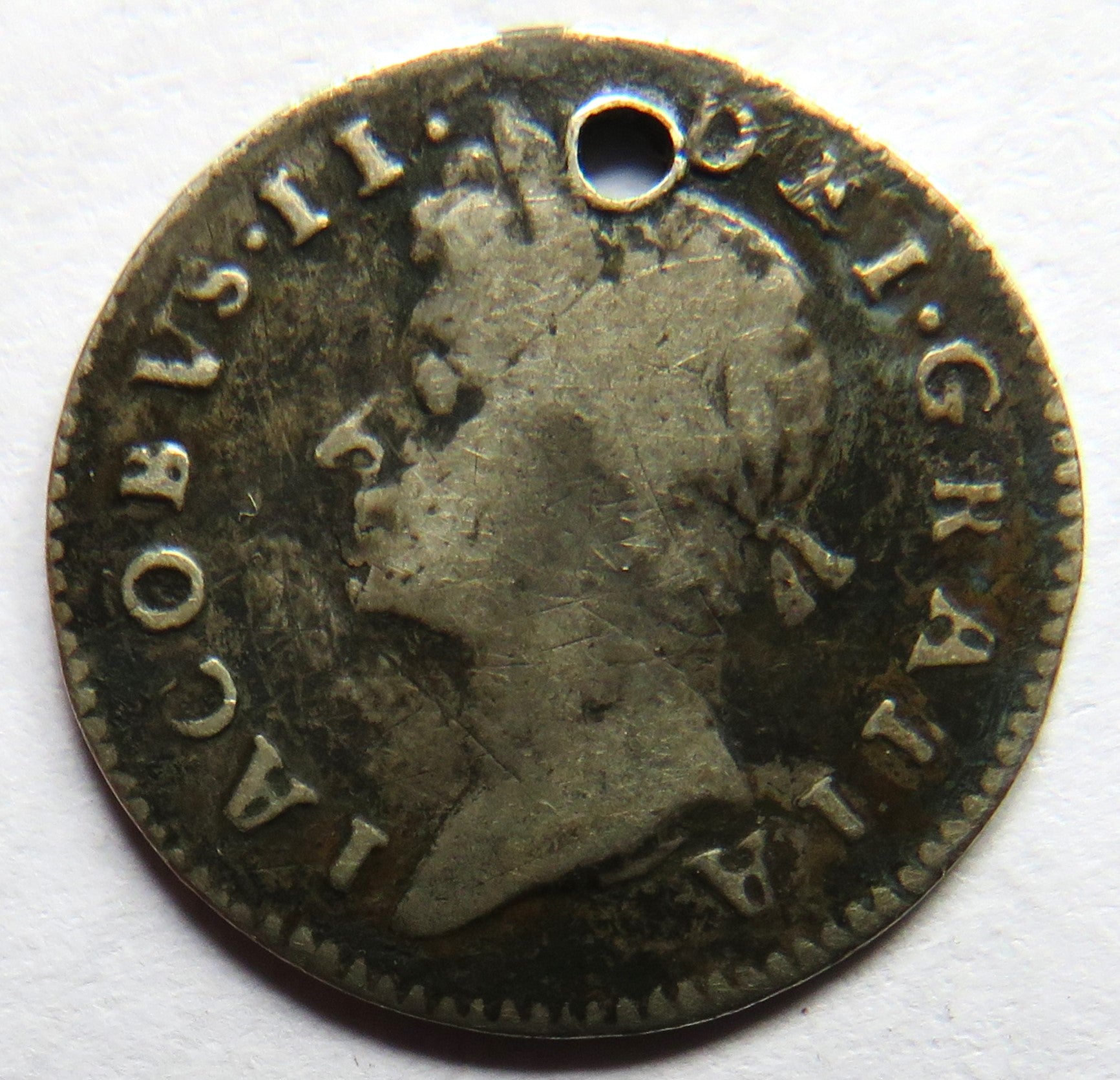 For Sale - 1687 King James II Silver Maundy Threepence Coin (Holed)