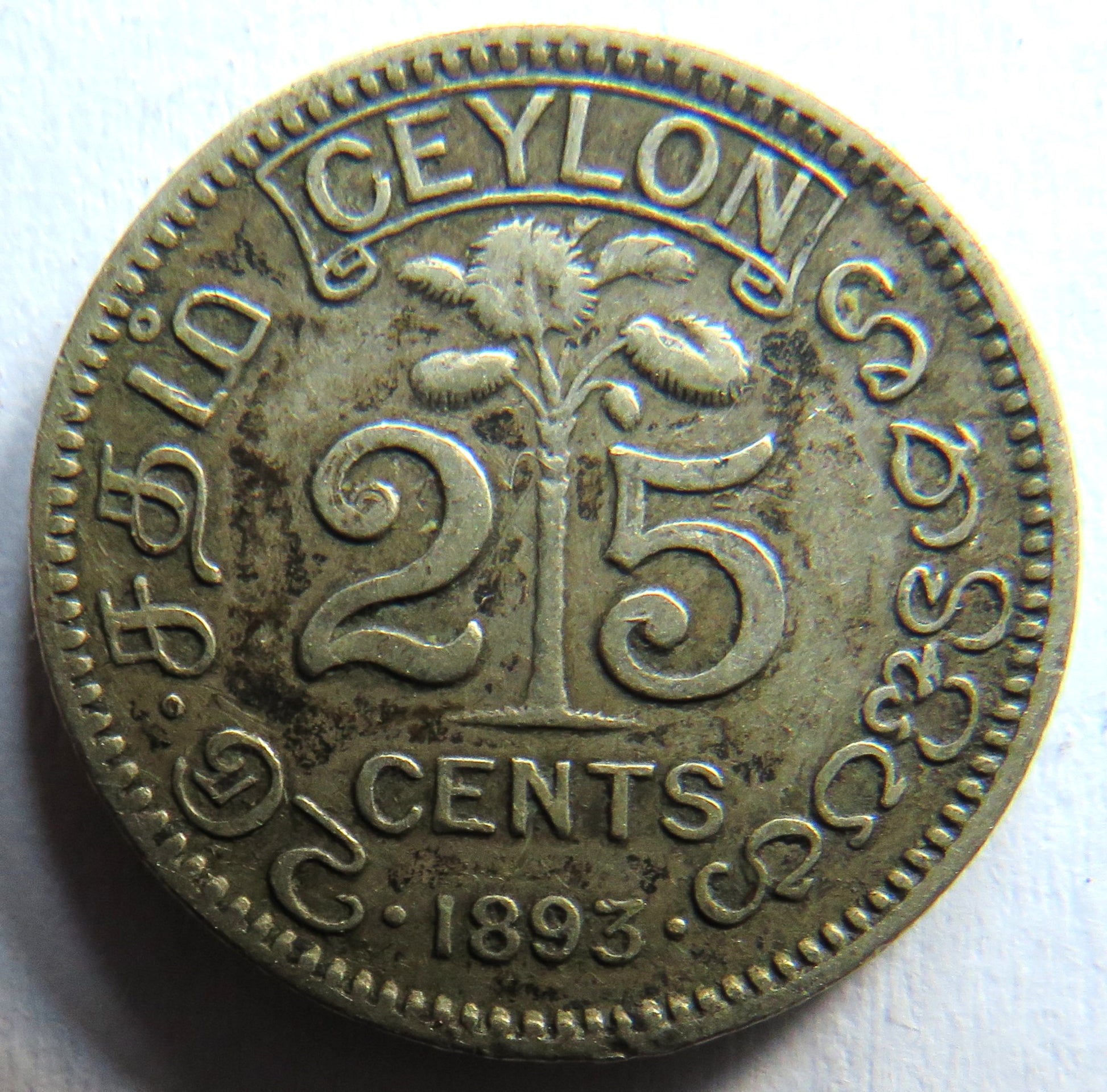 1893 Queen Victoria Ceylon Silver 25 Cents Coin