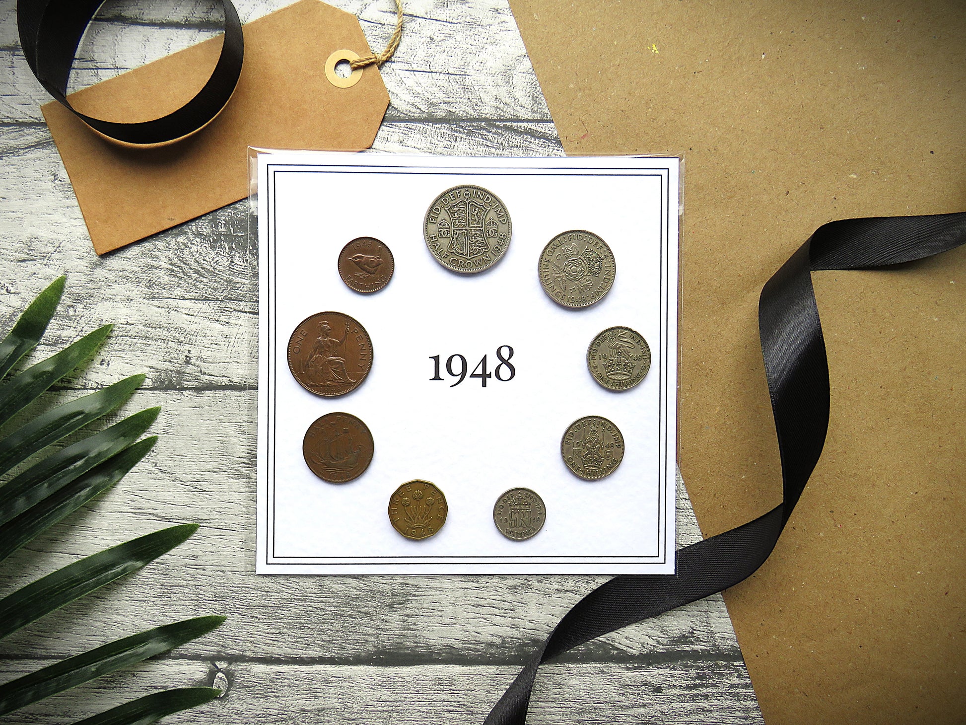 This genuine collection of eight original British coins, all minted in 1948, makes a wonderful keepsake - whether you’re celebrating a birthday, searching for a thoughtful retirement or anniversary gift, or adding a special piece to your collection. Each set is beautifully mounted on luxury hammered card (approx. 15cm x 15cm) and presented in a protective cellophane envelope.