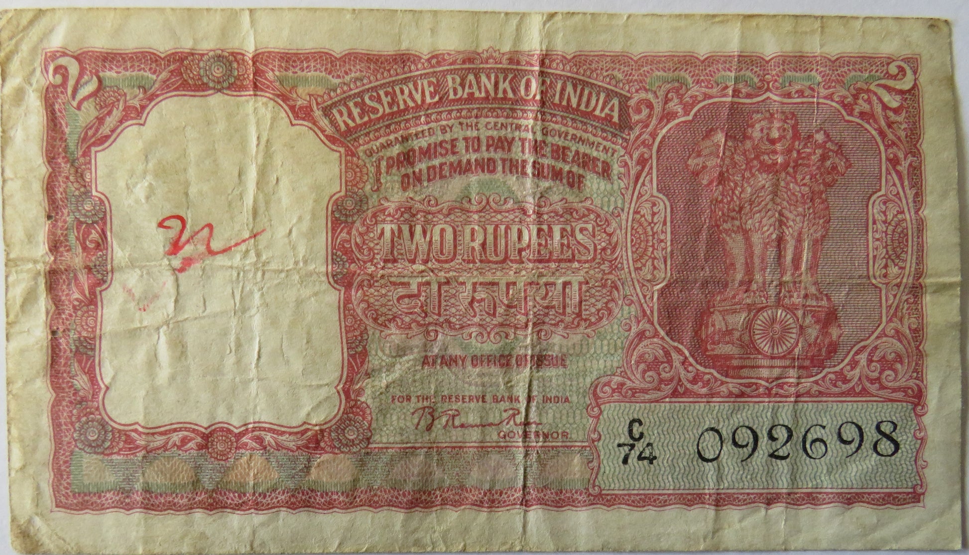 1949-1961 Reserve Bank of India Two Rupees Banknote