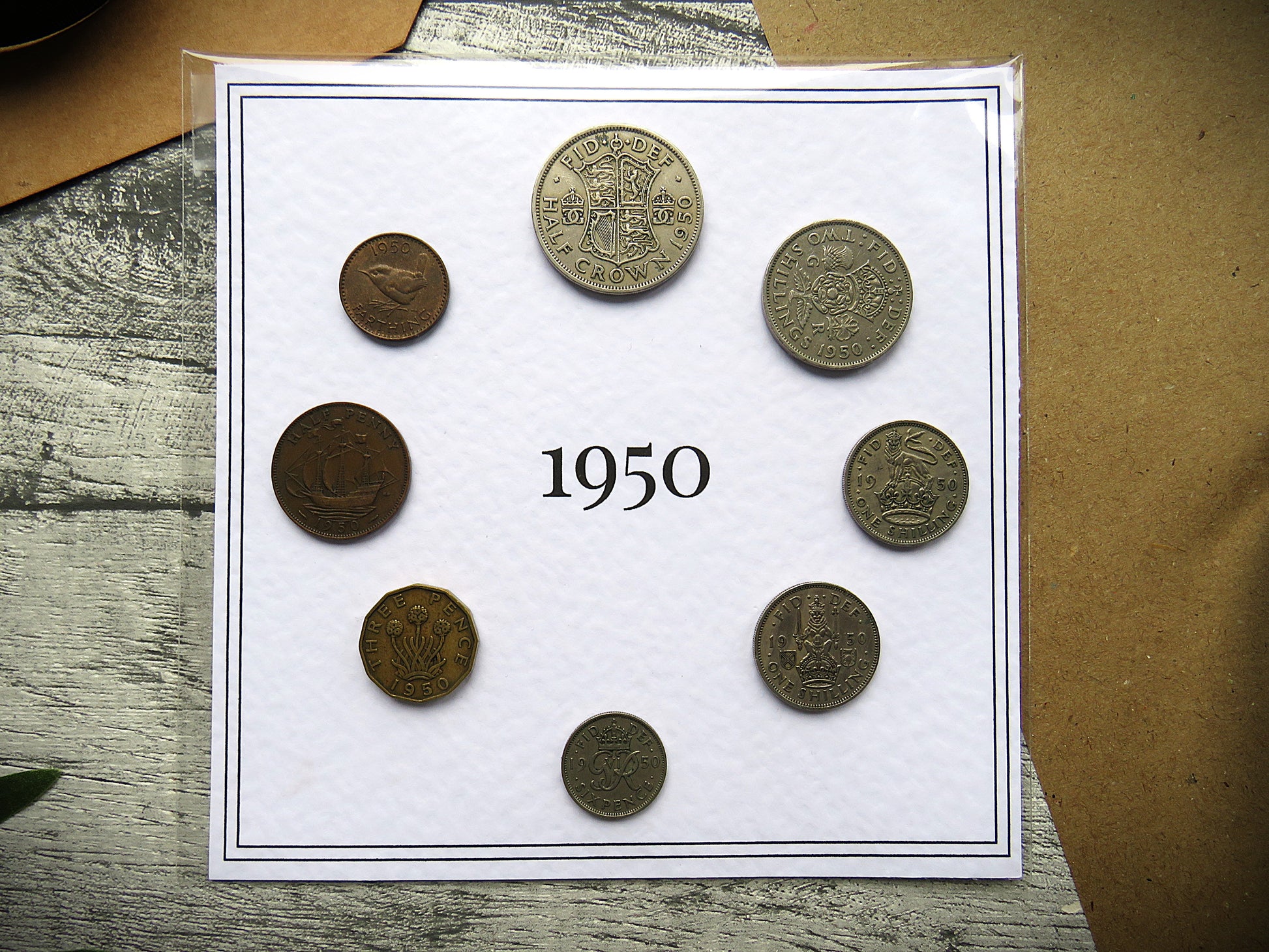 This genuine collection of eight original British coins, all minted in 1950, makes a wonderful keepsake - whether you’re celebrating a birthday, searching for a thoughtful retirement or anniversary gift, or adding a special piece to your collection. Each set is beautifully mounted on luxury hammered card (approx. 15cm x 15cm) and presented in a protective cellophane envelope.
