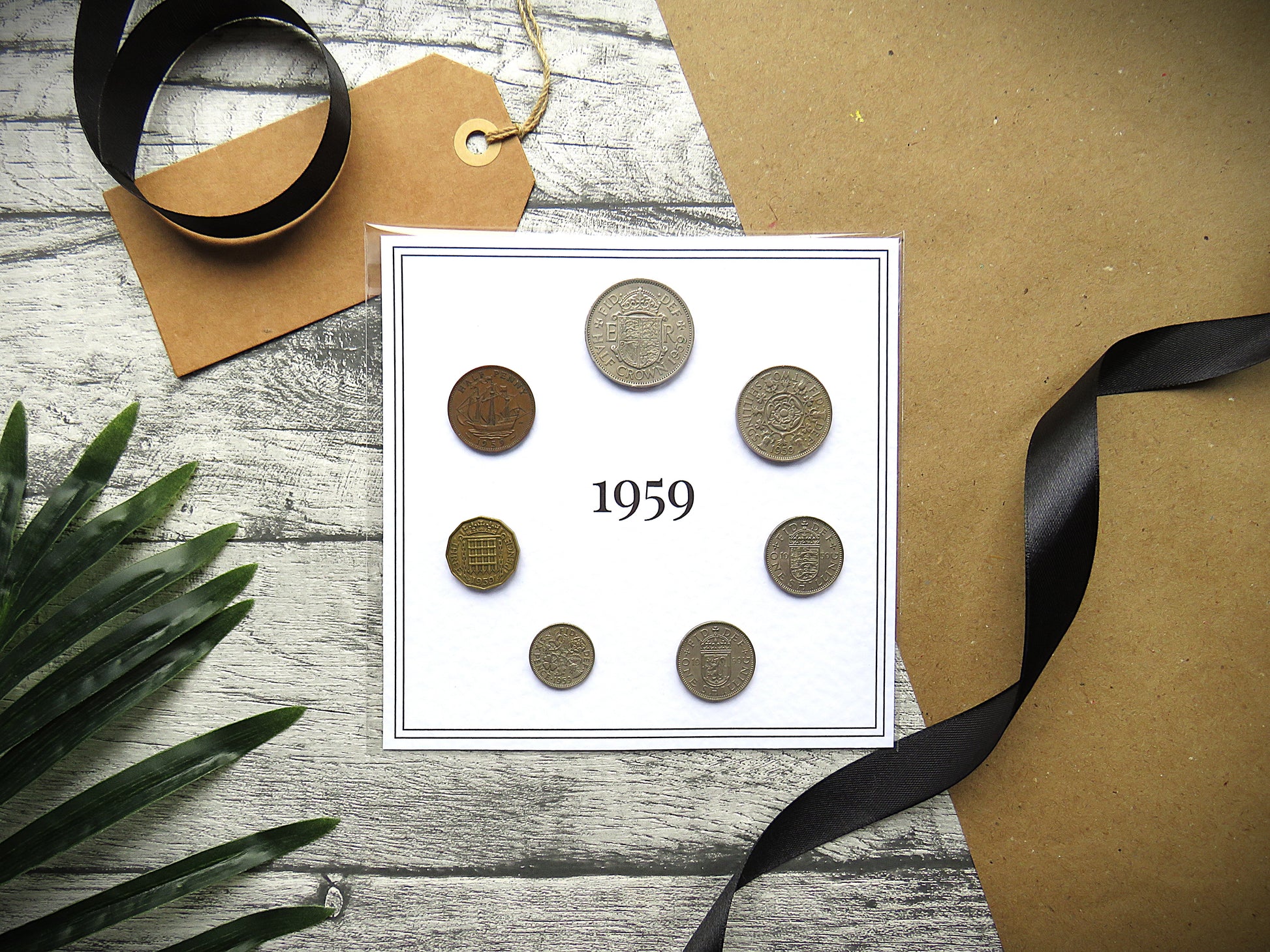 This genuine collection of seven original British coins, all minted in 1959, makes a wonderful keepsake - whether you’re celebrating a birthday, searching for a thoughtful retirement or anniversary gift, or adding a special piece to your collection. Each set is beautifully mounted on luxury hammered card (approx. 15cm x 15cm) and presented in a protective cellophane envelope.