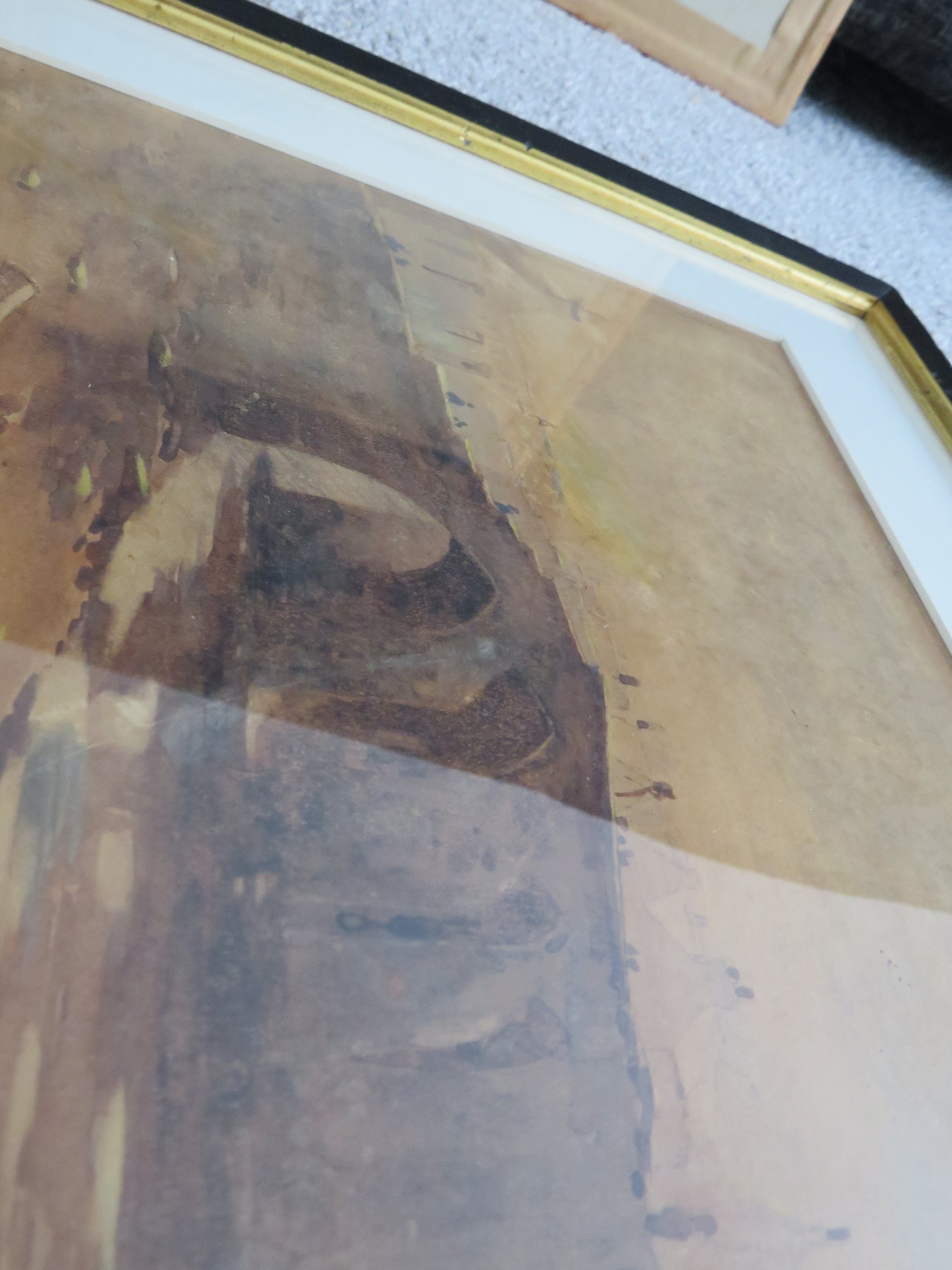 Framed under glass. Modern frame but has some edge wear to frame. Painting has been damaged, scratched or cut at several points and has been repaired not very well as the repairs can clearly be seen in light. See photos.