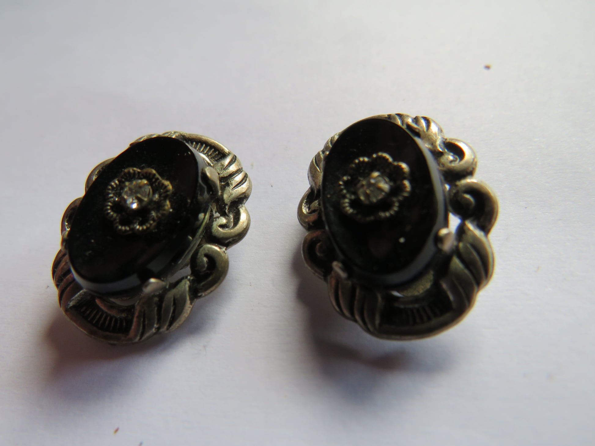 Vintage Ladies White Metal & Black Stone Clip On Earrings