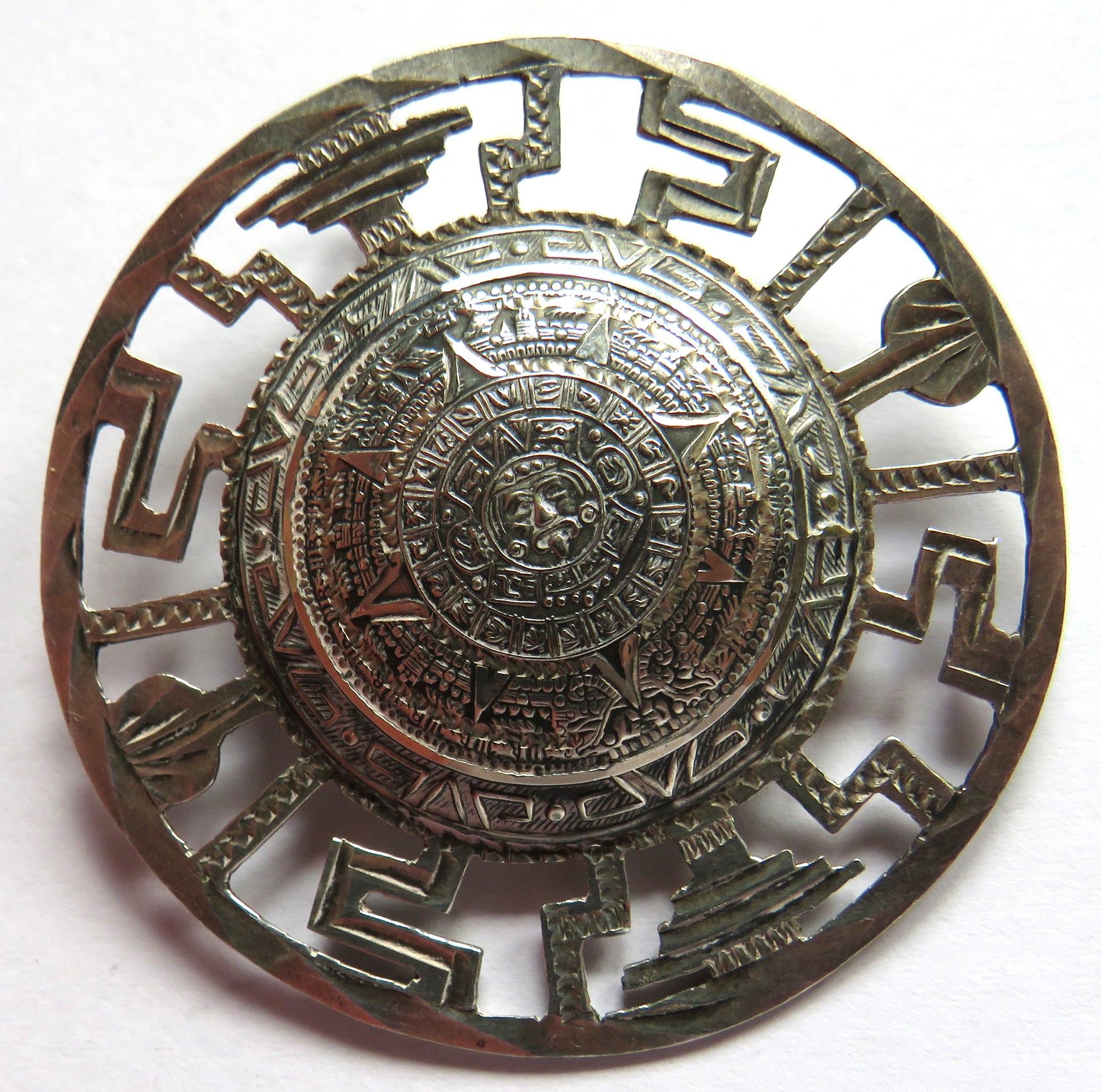 For Sale - Vintage Mexican Sterling Silver Disc Brooch - Aztec - Good Size