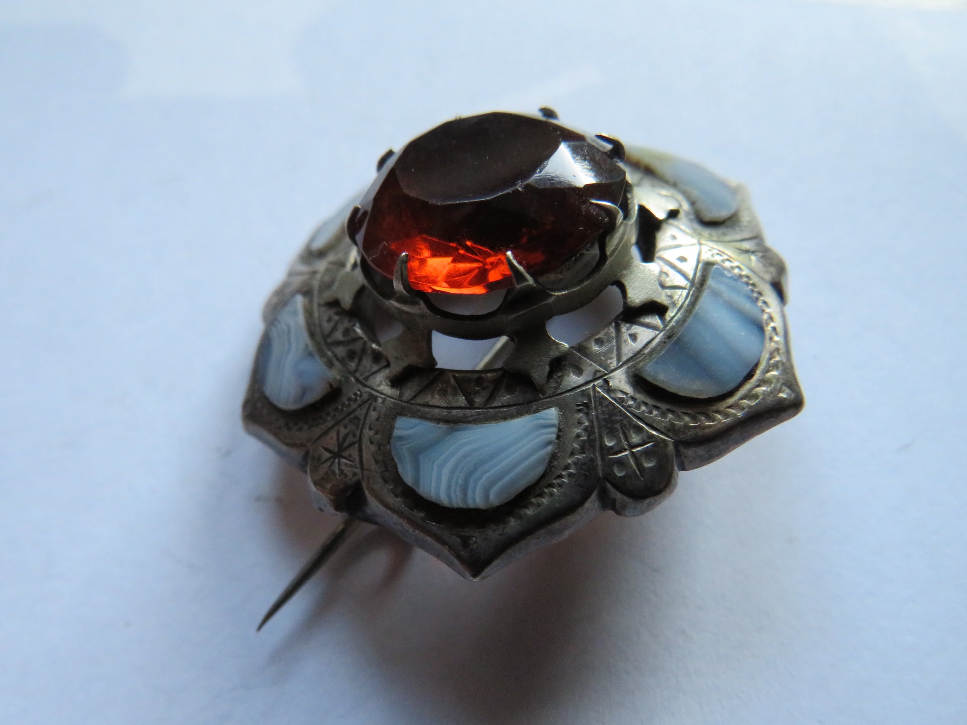 For Sale - Vintage Scottish White Metal & Agate Brooch